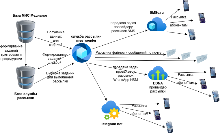Служба рассылки выполняет задания которых размещаются и хранятся в отдельно созданной базе находящейся рядом с базой Медиалога.